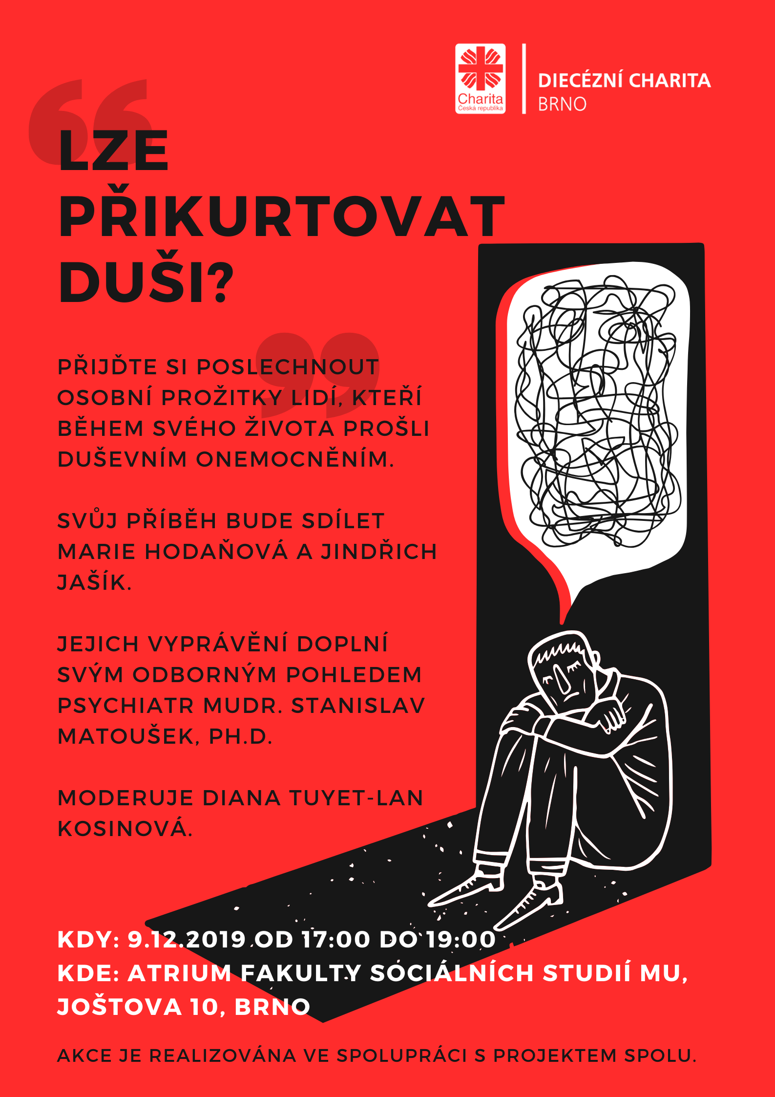 Taková akce proběhla i 9. prosince 2019 v Brně. Beseda s provokativním názvem Lze přikurtovat duši? za spolupráce s námi v atriu FSS MUNI uspořádalo centrum pro lidi s duševním onemocněním Celsuz spadající pod Diecézní charitu Brno. Moderováni Dianou Tuyen-Lan Kosinovou zde své zkušenosti sdíleli peer-pracovníci Marie Hodaňová a Jindřich Jašík a osvícený psychiatr Stanislav Matoušek. Náhledy všech těchto inspirativních osob byly velmi obohacující.