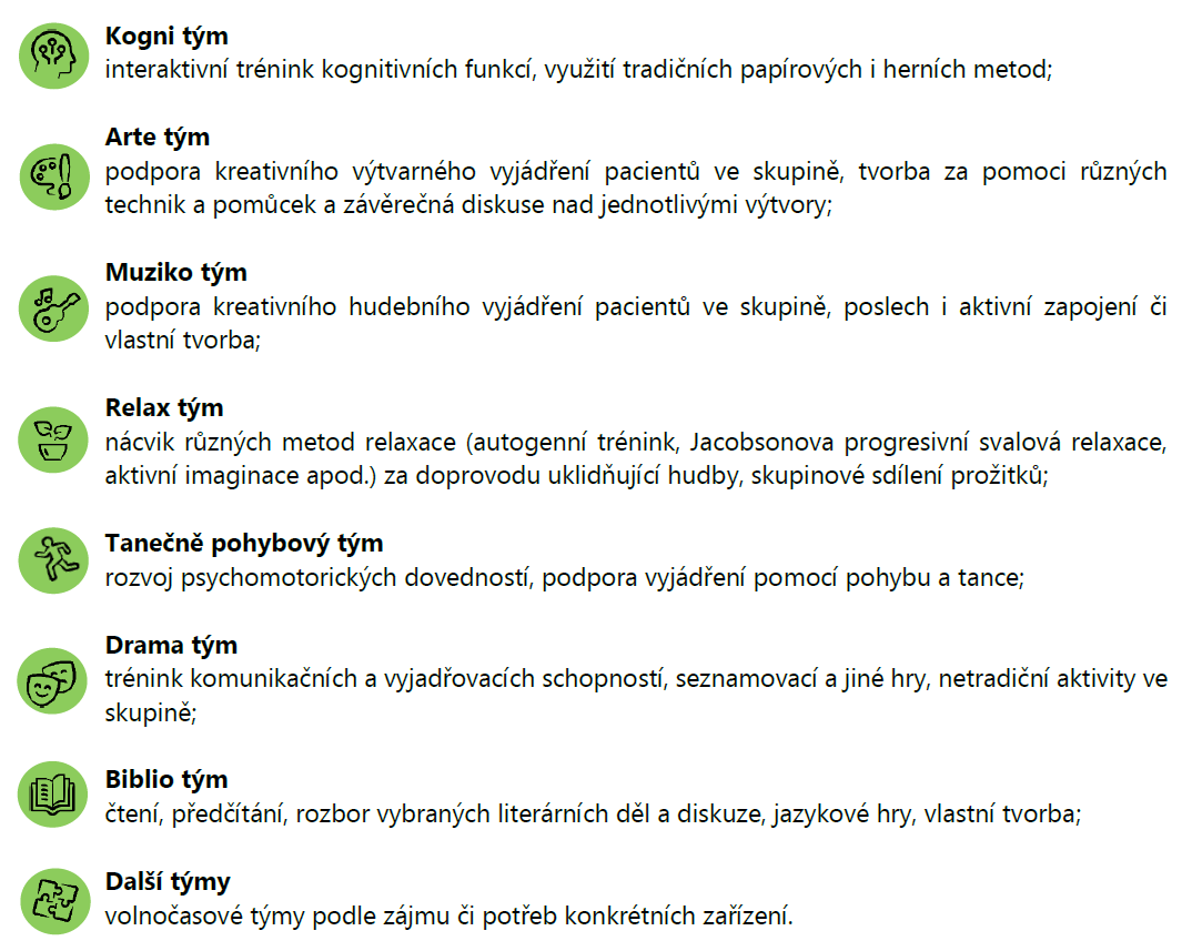 Pacienti se mohou se studenty setkat v rámci některého z mnoha volnočasových týmů. Dobrovolná účast na těchto skupinových aktivitách umožňuje pacientům aktivní využití času během hospitalizace. Dobrovolníci se snaží kromě důkladného vedení dané činnosti také o vytváření příjemné atmosféry uvnitř skupiny. Jedním z našich záměrů je i to, aby se pacienti navzájem lépe poznali a byli schopni spolu v rámci činnosti spolupracovat.